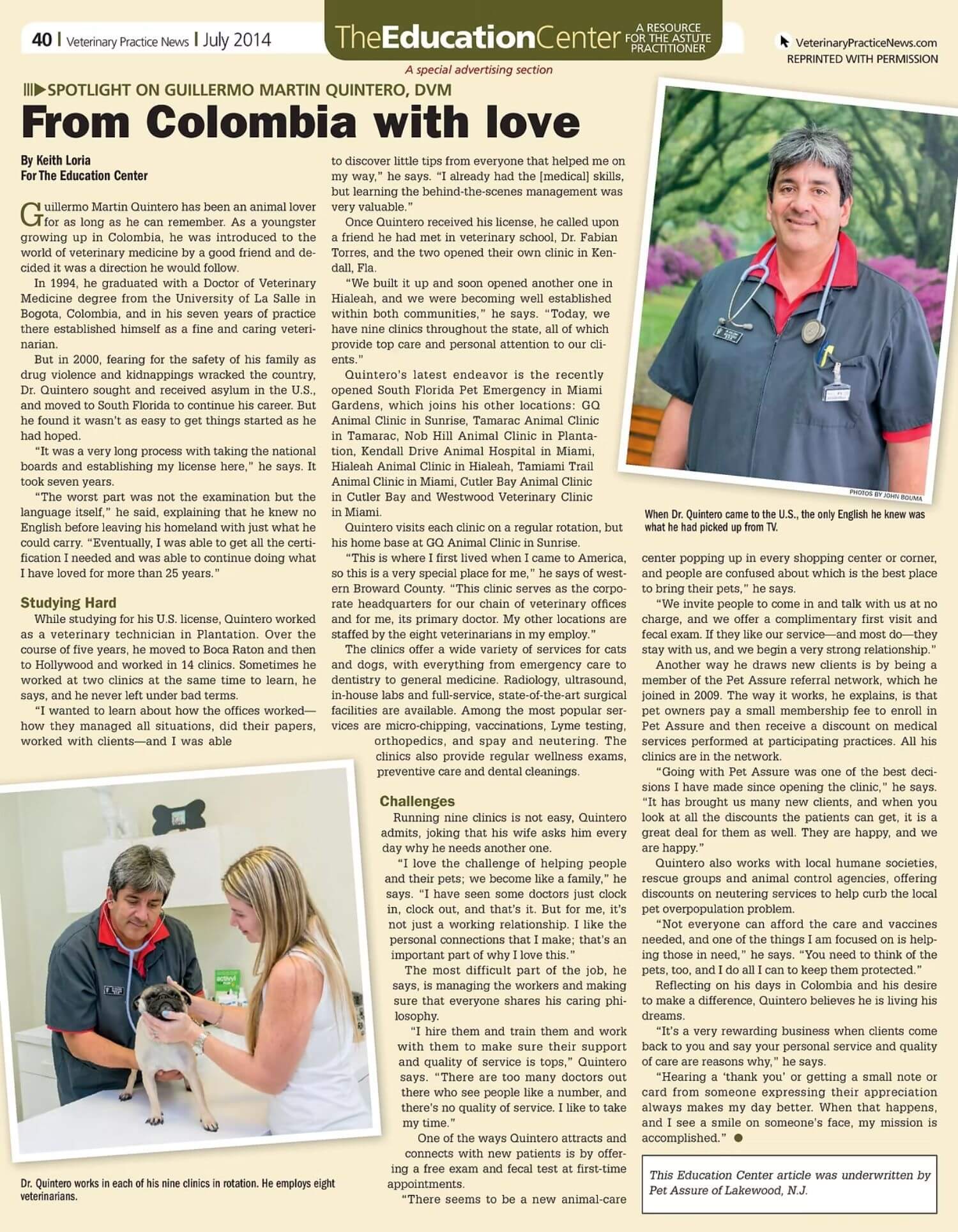 Desde sus humildes comienzos en Colombia, nuestra familia empezó con el Dr. Quintero. Él y su familia emigraron a los Estados Unidos en el año 2000 en busca de una vida mejor. Al hacerlo, él y su familia decidieron ayudar a otros en el camino estableciendo dos clínicas veterinarias familiares en el sur de Florida: Nob Hill Animal Clinic en Plantation y South Florida Pet Emergency en Hialeah, cada una de ellas con equipos amigables y bilingües listos para apoyar cada etapa de la vida de su mascota.